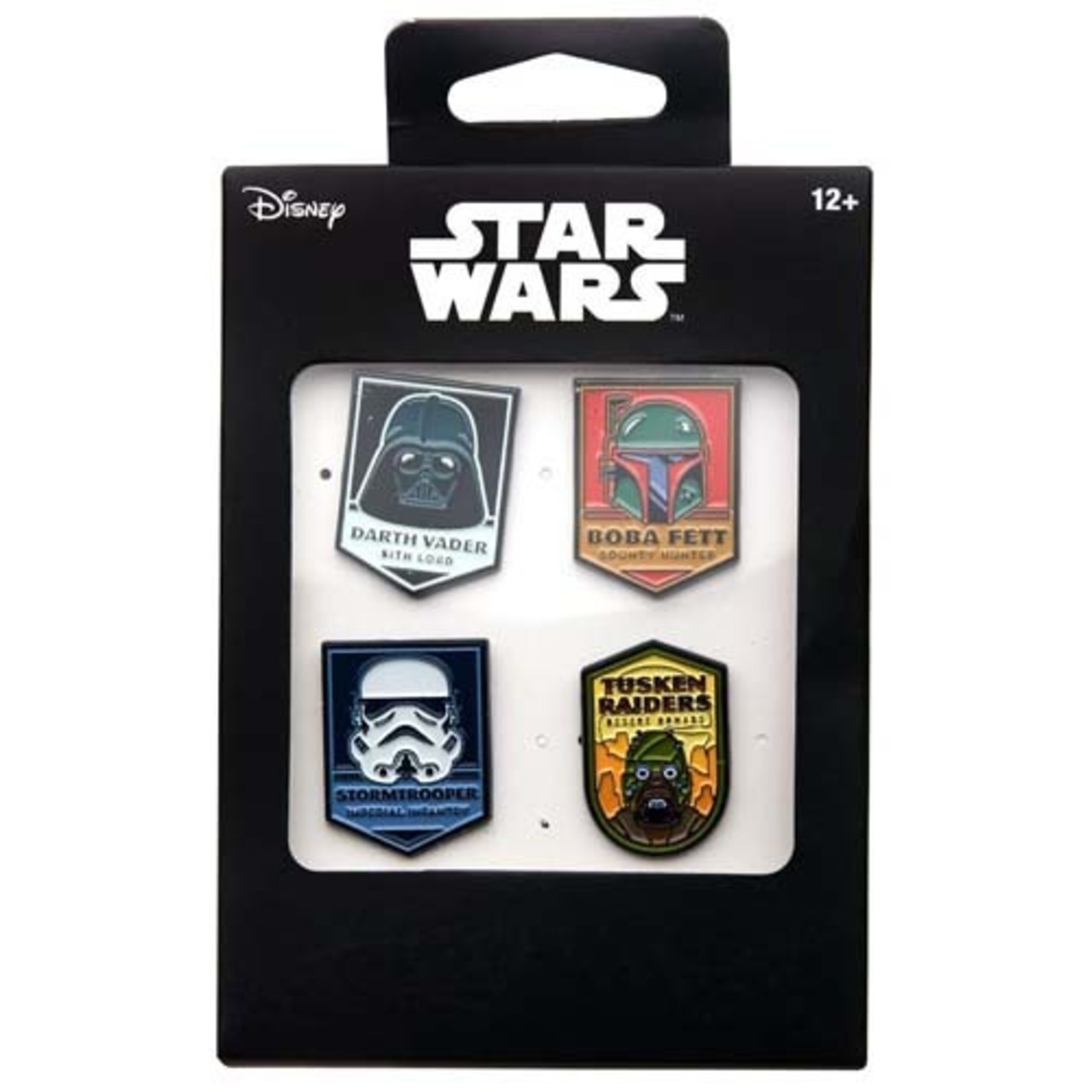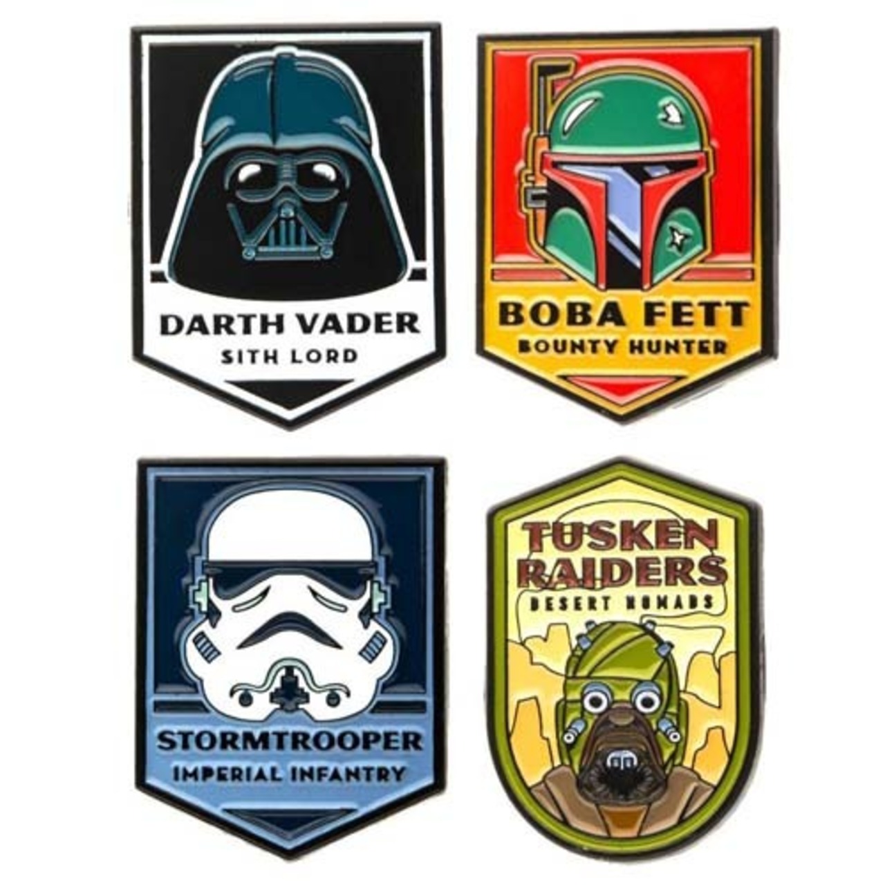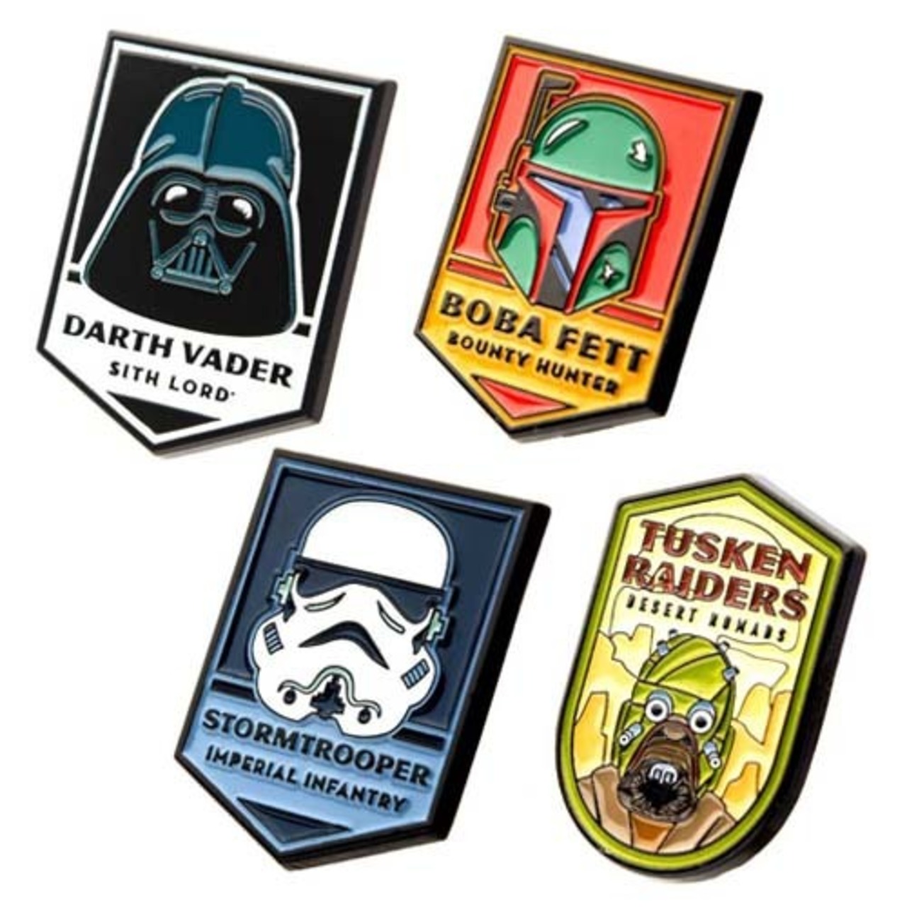 ダークサイドのダース・ベイダー、ストームトルーパー 、ボバ・フェット、タスケン・レイダーのラペルピン4個セットです。